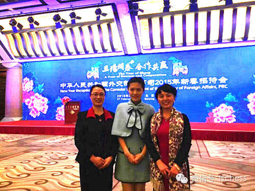 Three-time Women’s World Chess Champion 侯逸凡 (Hóu Yìfán) (pictured above centre) attended as a guest of honour the annual New Year Reception for Chinese and Foreign Consular Personnel which took place at the 钓鱼台国宾馆 (Diàoyútái Guesthouse) in 北京 (Běijīng), China on February 27, 2015. Photo: mp.weixin.qq.com. |
