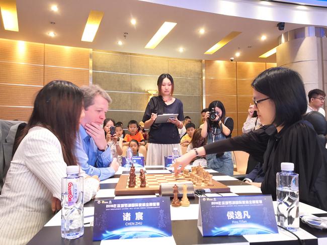 Four-time Women’s World Chess Champion and Rhodes Scholar 侯逸凡 (Hóu Yìfán) playing mixed doubles with 余泱漪 (Yú Yāngyī) on their triumphant way through the 2019 深圳 (Shēnzhèn) 罗湖 (Luōhú) All-Star Chess Tournament at the Sunshine Hotel in 深圳 (Shēnzhèn), China. Photo: 梁自明 (Liáng Zìmíng)/新华社 (Xīnhuá News Agency).