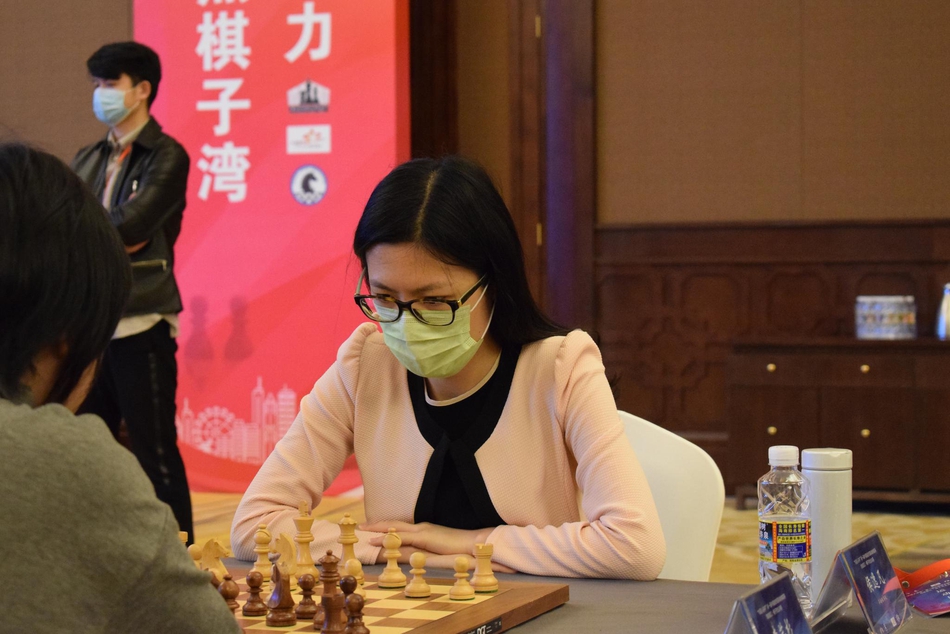 Rxf8 Qxf8 33. Rxe6 Qh8 34. Rd6+ 1-0侯逸凡 (Hóu Yìfán) changed dress for her noon second-round game, contenting herself with conceding a draw to 任肖伊 (Rèn Xiàoyī). Photo: Chinese Chess Association. |