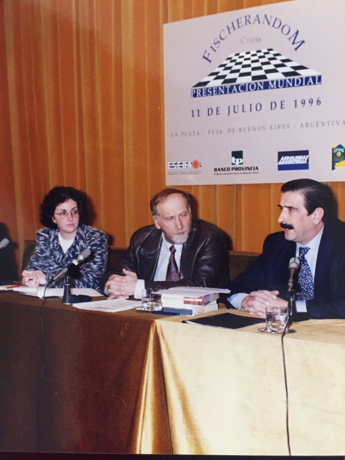On July 11, 1996 11th World Chess Champion Bobby Fischer held a final press conference in La Plata, Argentina prior to the beginning of the first ever match at Fischerandom chess between Eugene Torre from Philippines and Pablo Ricardi from Argentina, which was set to commence on July 12 at Centro Cultural Pasaje Dardo Rocha. On occasion Fischer presented his clock and shuffler, two key devices required for his new contemporary chess. Unfortunately the match was eventually cancelled in a dispute over sponsorship. Photo credit: Gabriela Scandura. |
